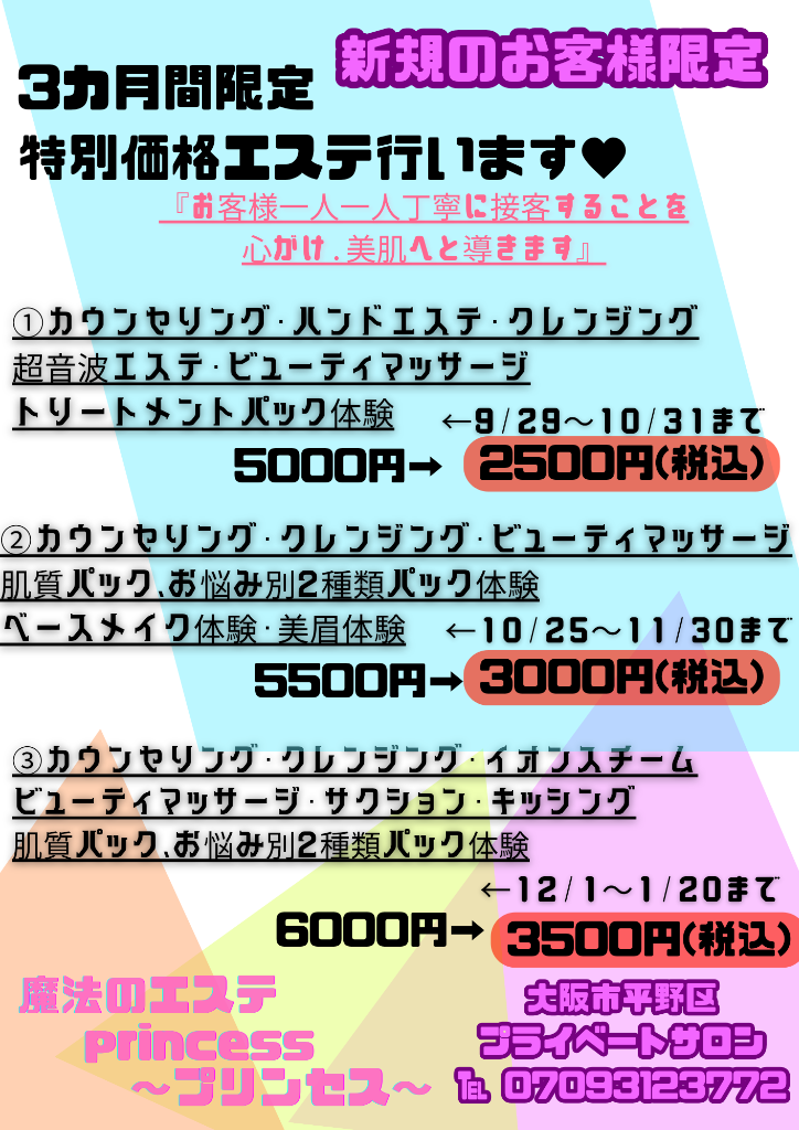 大阪市平野区でエステサロンをお探しでしたら、肌質改善へ導く“魔法のエステ "princess"~プリンセス~”へぜひお越しください。